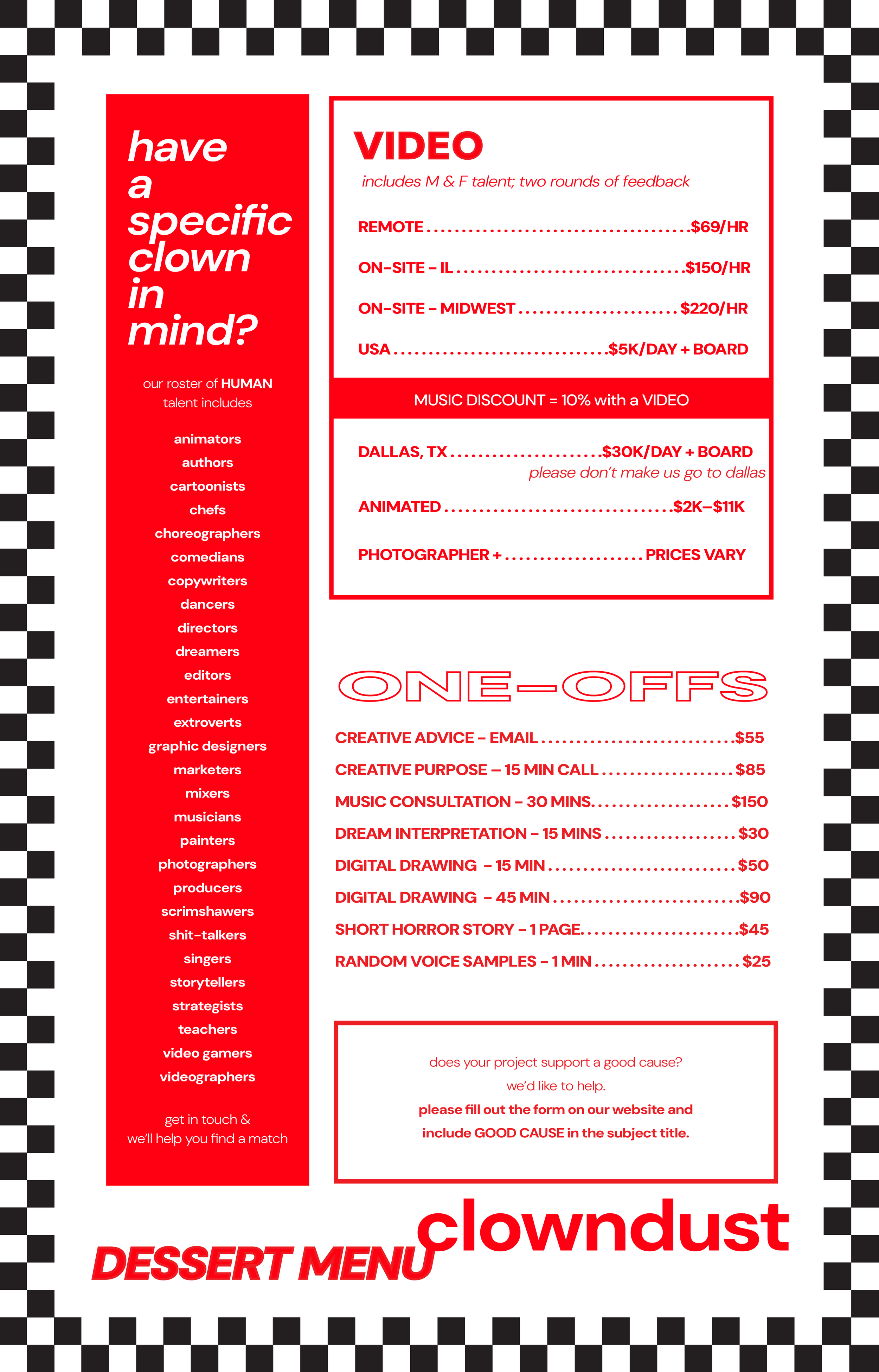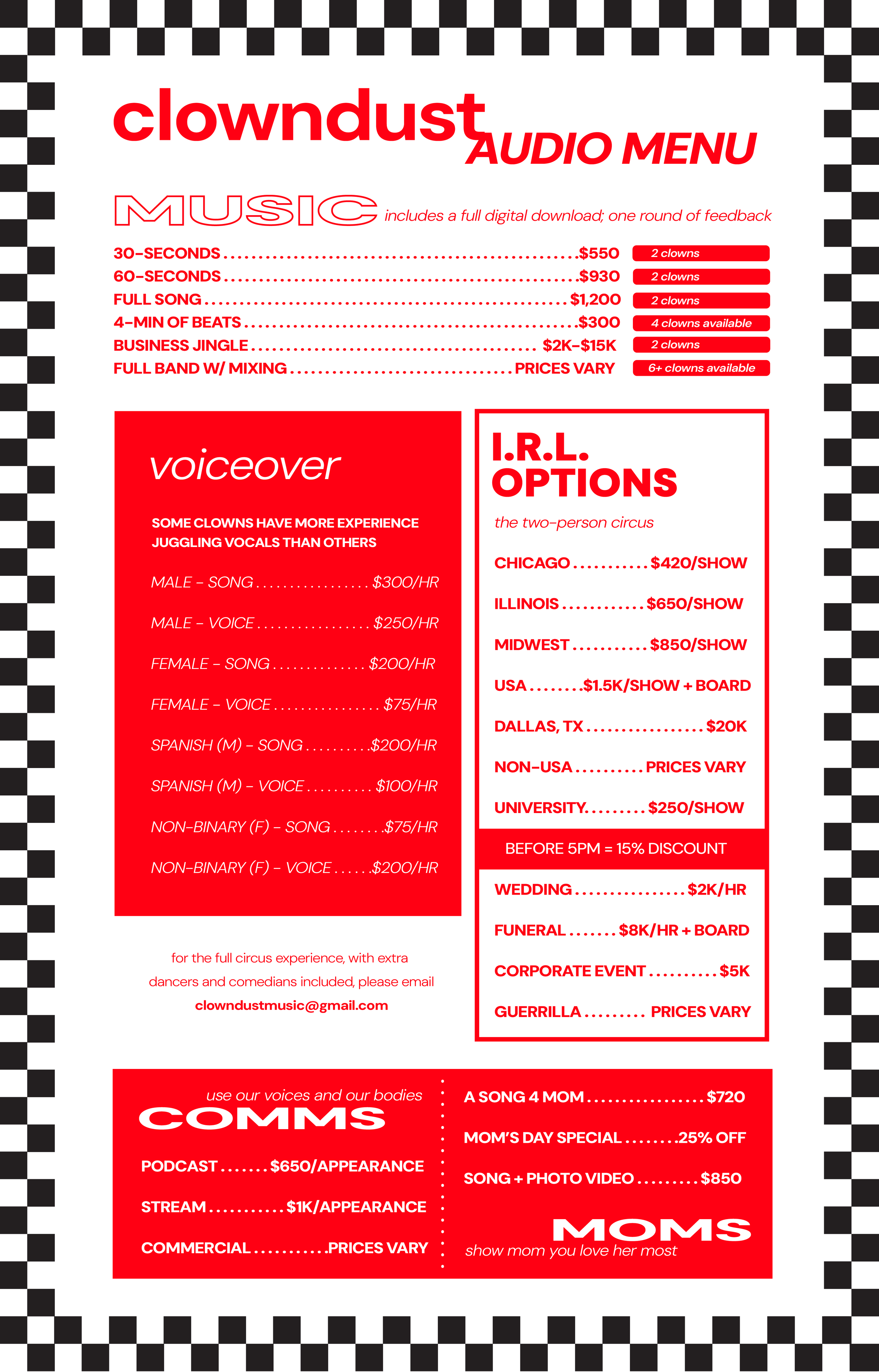 MENU WANT YOUR OWN MUSIC? 💿 WANT YOUR OWN MUSIC? 💿 WANT YOUR OWN MUSIC? 💿 Download our music menu by clicking hereor view it below ⬇️ CLOWN DUST HAS THE RIGHT TO REFUSE OFFERS. (We are pretty certain of this.)